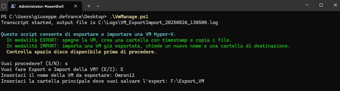 Export (E): Spegne la VM, ne crea una copia in una cartella con timestamp (es. VM_Export_2023-10-27_10-30-00), e la riavvia. Ideale per creare backup sicuri.