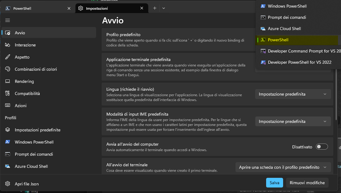 Ctrl + ,). - Nella sezione Profilo di avvio, seleziona "PowerShell" (icona scura).