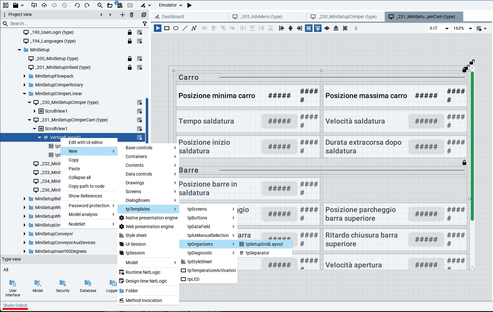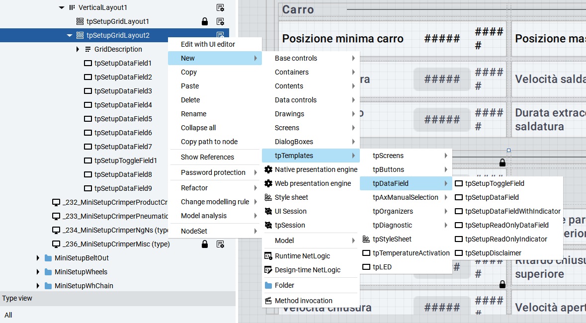 Per aggiungere i singoli parametri, clicca con il tasto destro sul tpSetupGridLayout e seleziona: